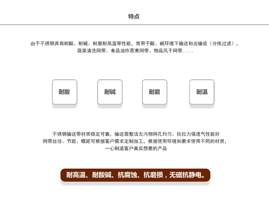 不銹鋼網(wǎng)帶屬于非標(biāo)準(zhǔn)件,我們將根據(jù)你提供的規(guī)格長寬,材質(zhì),絲徑,編制結(jié)構(gòu)尺寸,支軸直徑,支軸間距,鏈條型號等數(shù)據(jù)核算成本和制作.