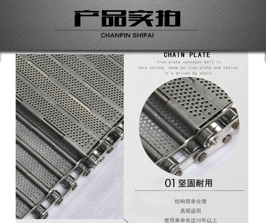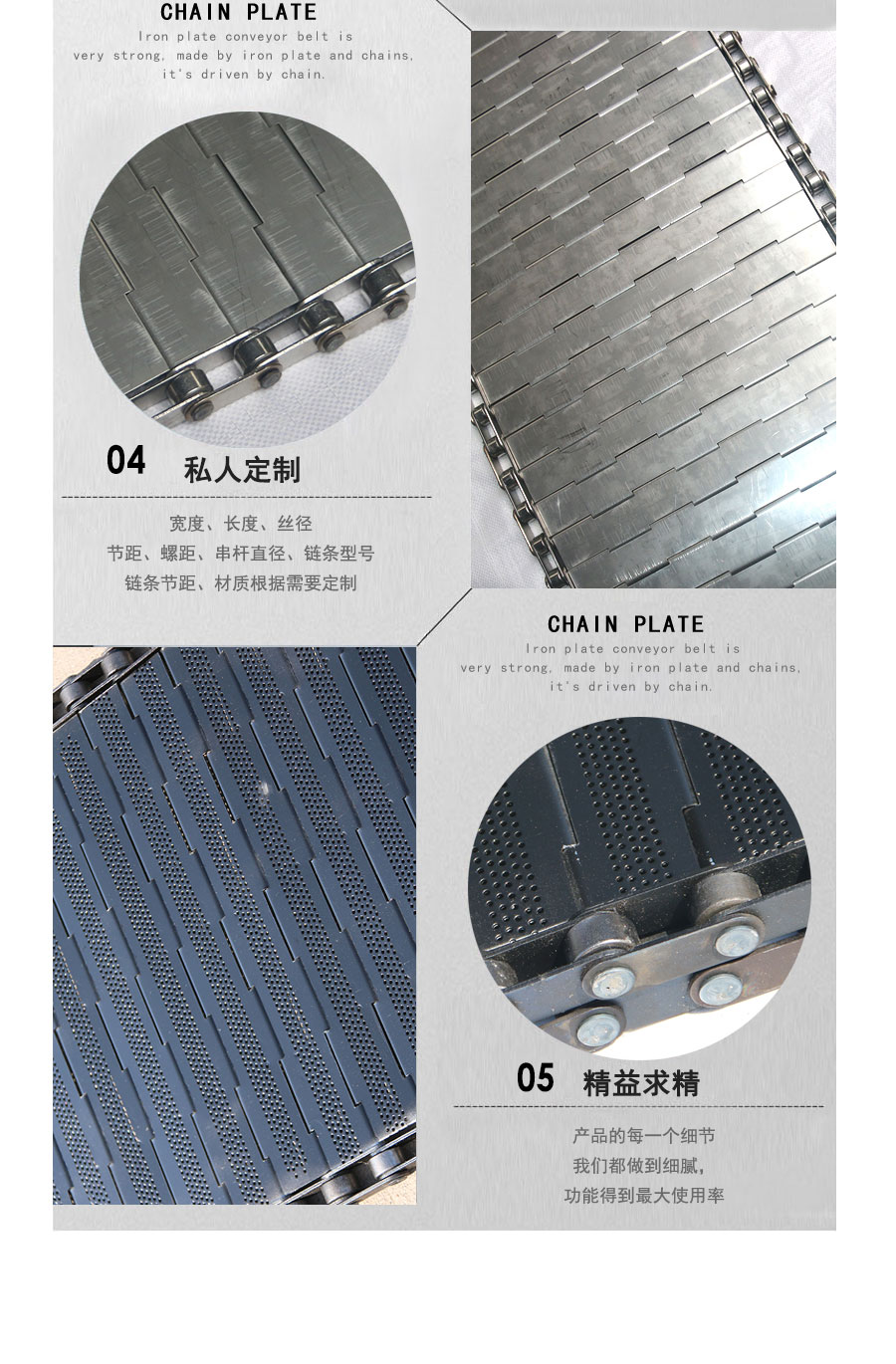 鏈板輸送帶:是采用不銹鋼板沖壓成型,鏈條傳動(dòng),每節(jié)由6-10mm支撐桿連接,其運(yùn)動(dòng)平穩(wěn)、力量大,適合用于輸送細(xì)小的高密度物件,輸送過程中運(yùn)轉(zhuǎn)平穩(wěn),安裝更換方便,成本高,使用壽命較長。