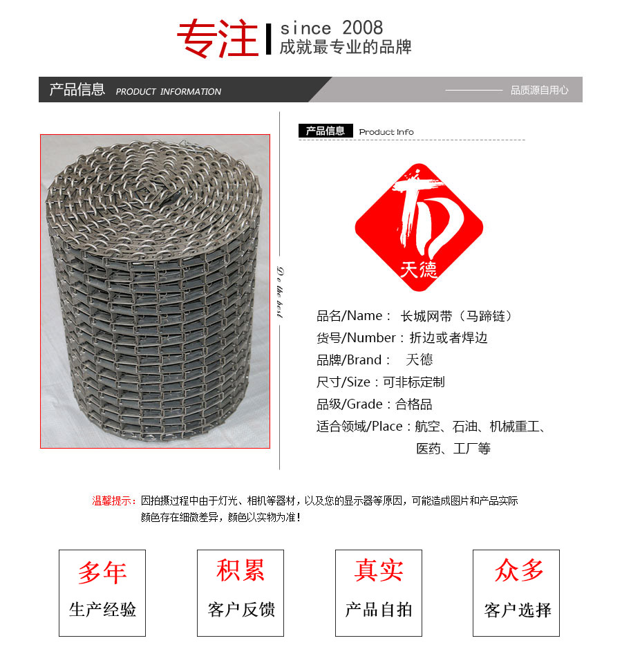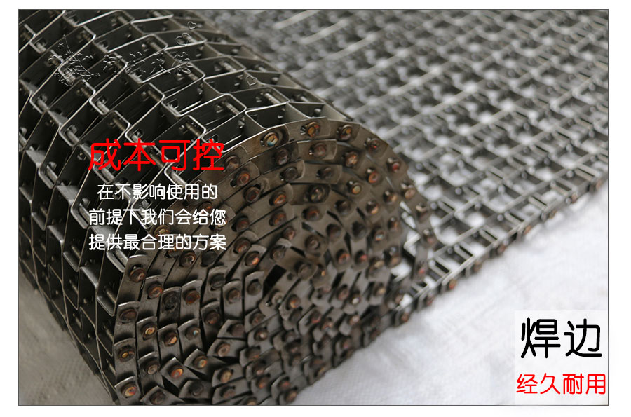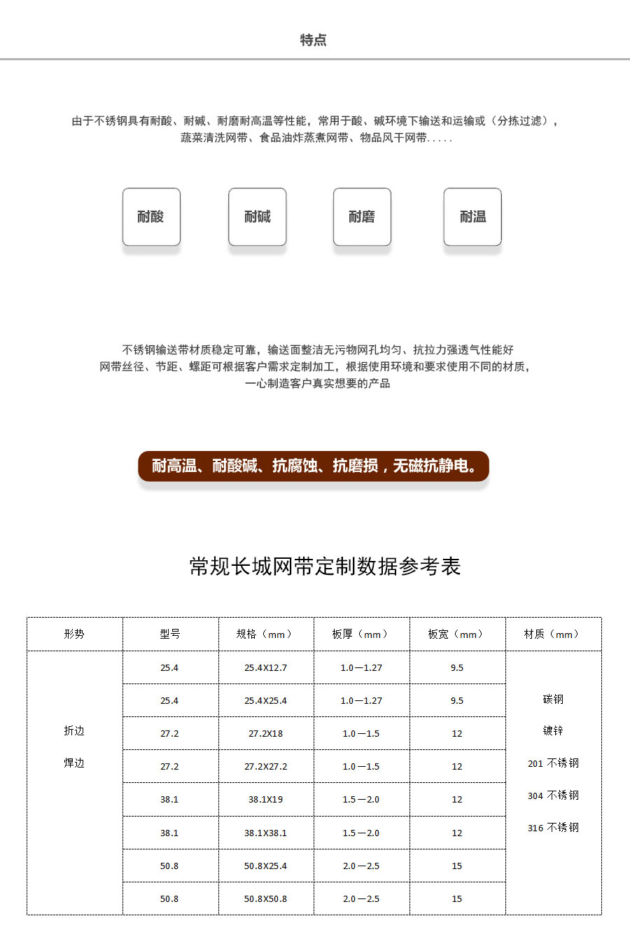 長城網(wǎng)帶材質(zhì):有A3低碳鋼、45#鋼、1Cr13耐熱鋼、 不銹鋼、304不銹鋼、1Cr18Ni9Ti不銹鋼、0Cr18Ni14NO2CU2耐熱耐酸鋼等