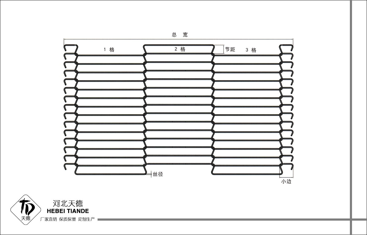 乙字網(wǎng)帶使用不銹鋼高彈柔韌絲制作。網(wǎng)帶多用單小邊結(jié)構(gòu)(常用),雙小邊結(jié)構(gòu)用于特殊用途。可以用于直線輸送機(jī),也可以用于轉(zhuǎn)彎輸送機(jī)。